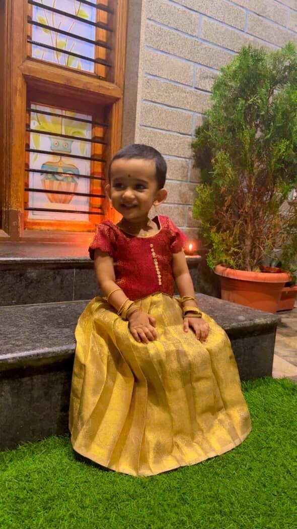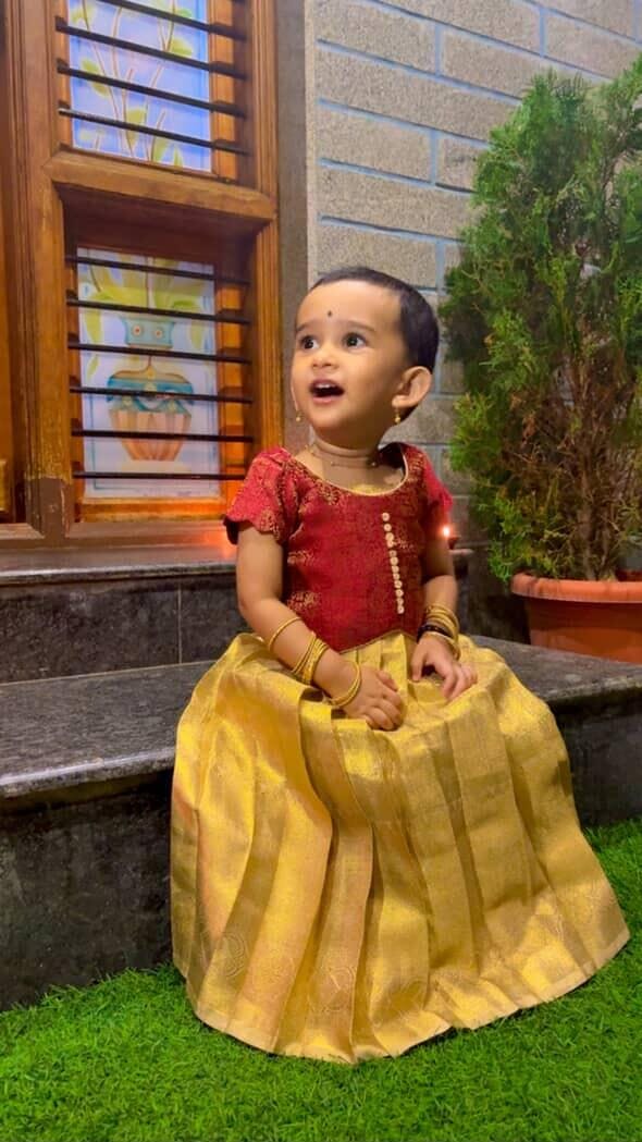 Fabric: Gold Tissue Silk (Lehenga), Red raw silk (Blouse)
