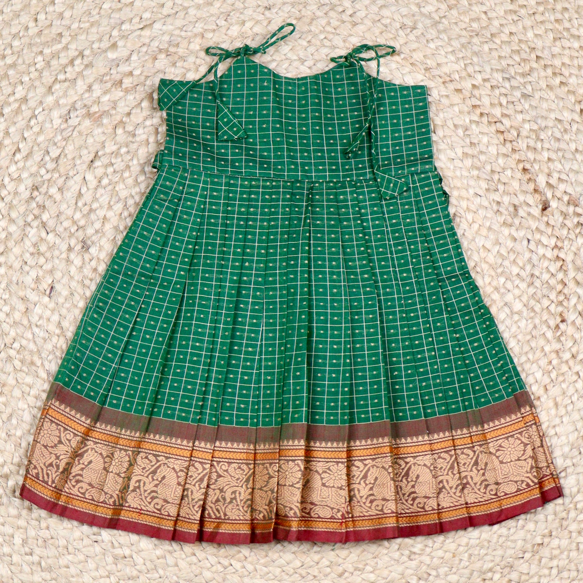 Bottle Green Checked Ethnic Frock with Zari Border