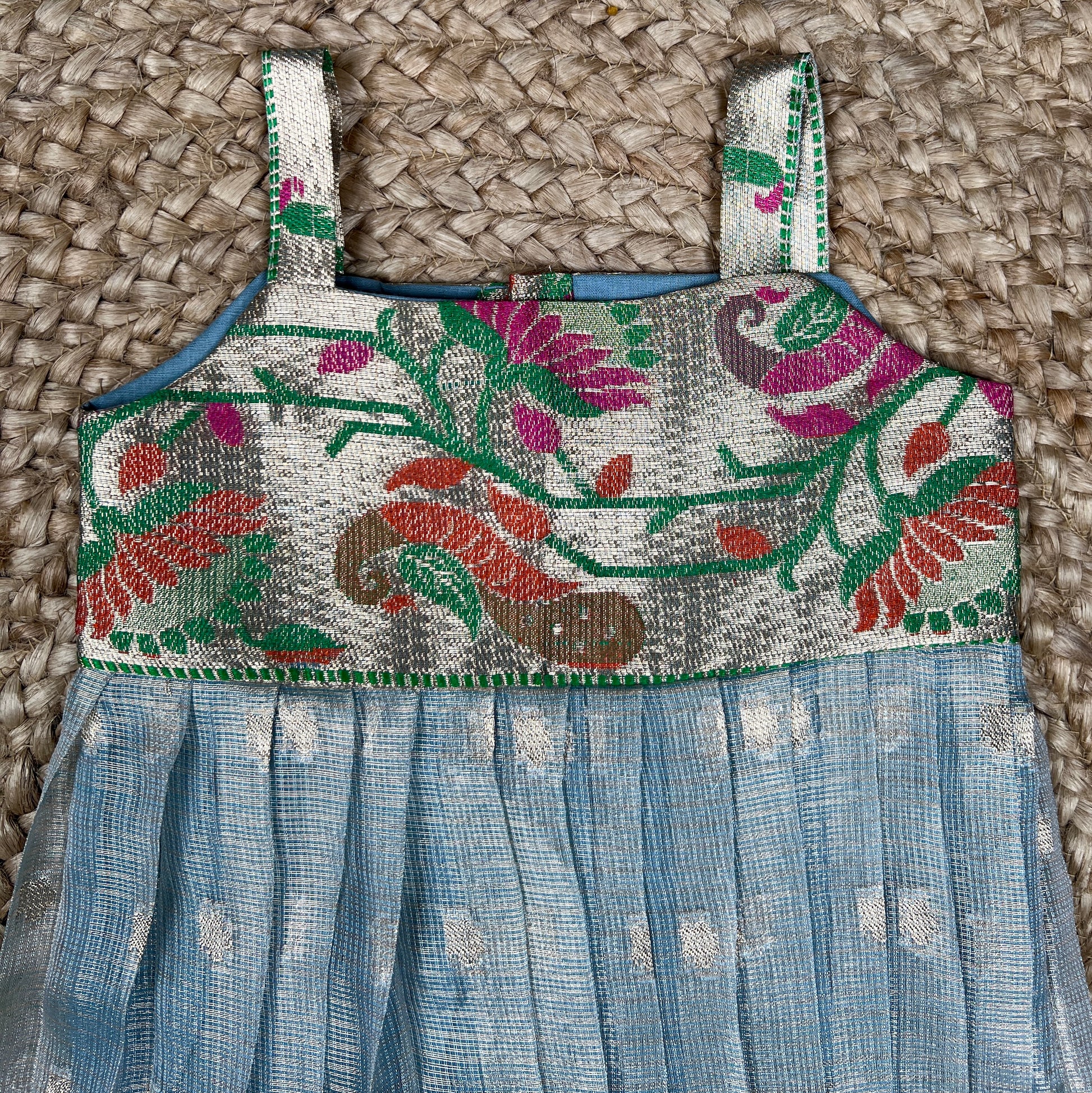 Powder Blue Silk Ethnic Frock with Printed Yoke