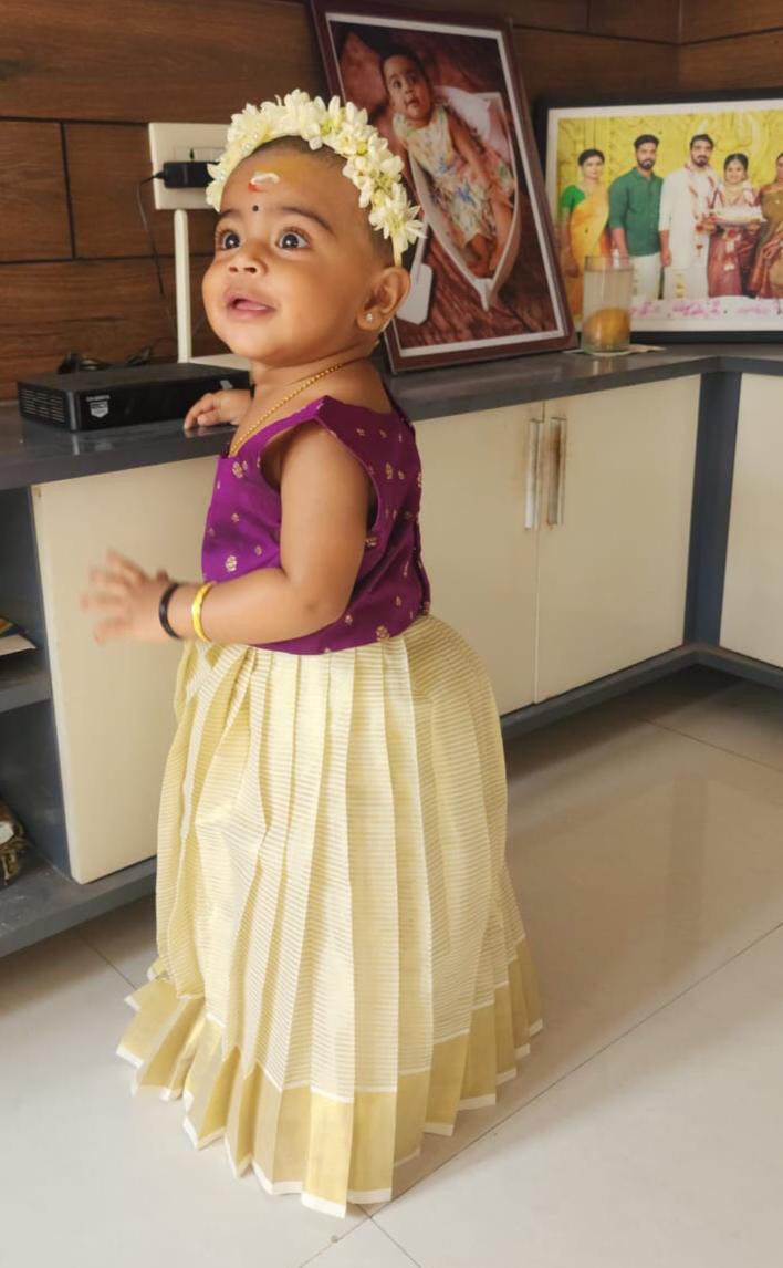 Colour: Ivory / Cream Lehenga with Gold Stripes & Kasavu Border; Orange Blouse