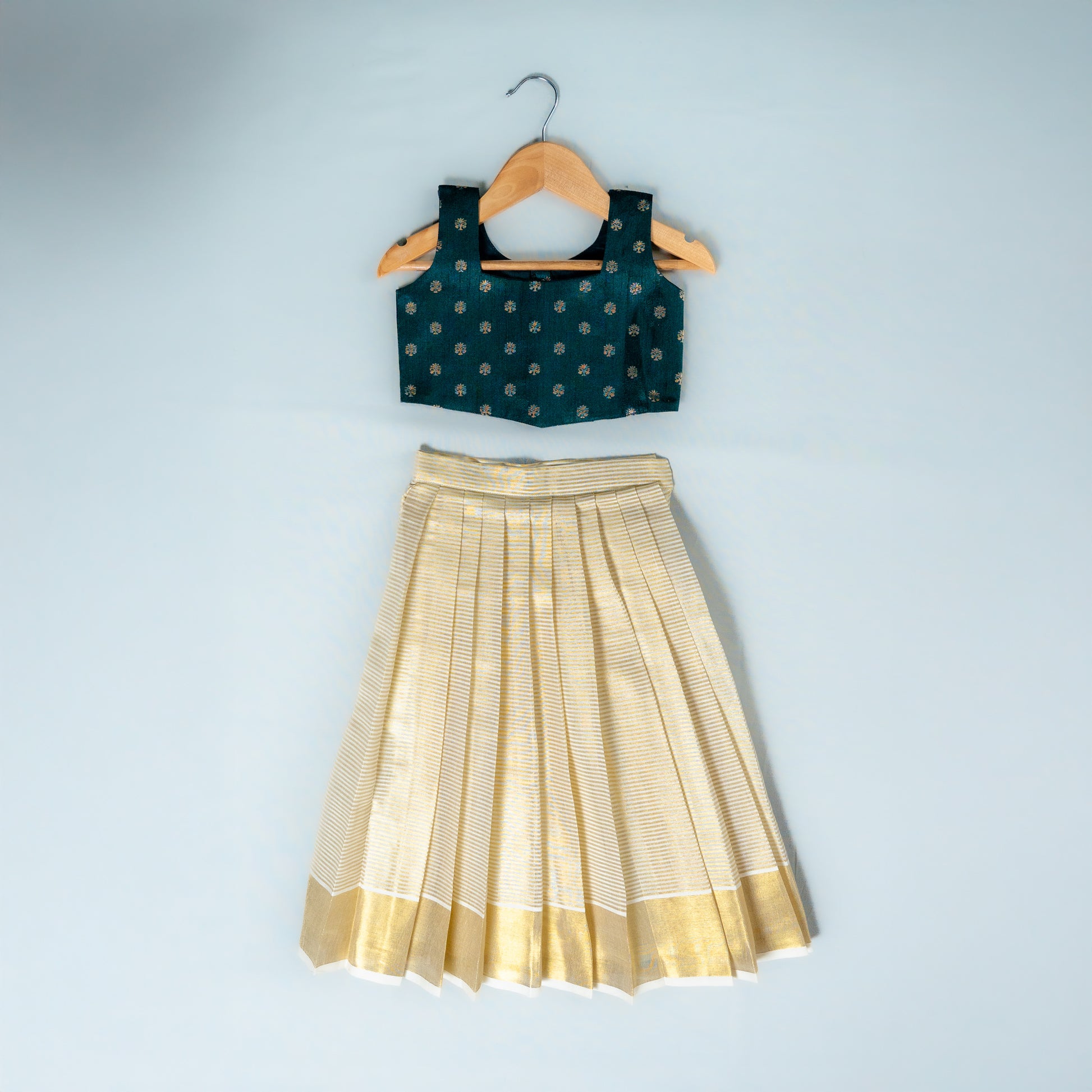 Colour: Ivory / Cream Lehenga with Gold Stripes & Kasavu Border; Green Raw silk Blouse